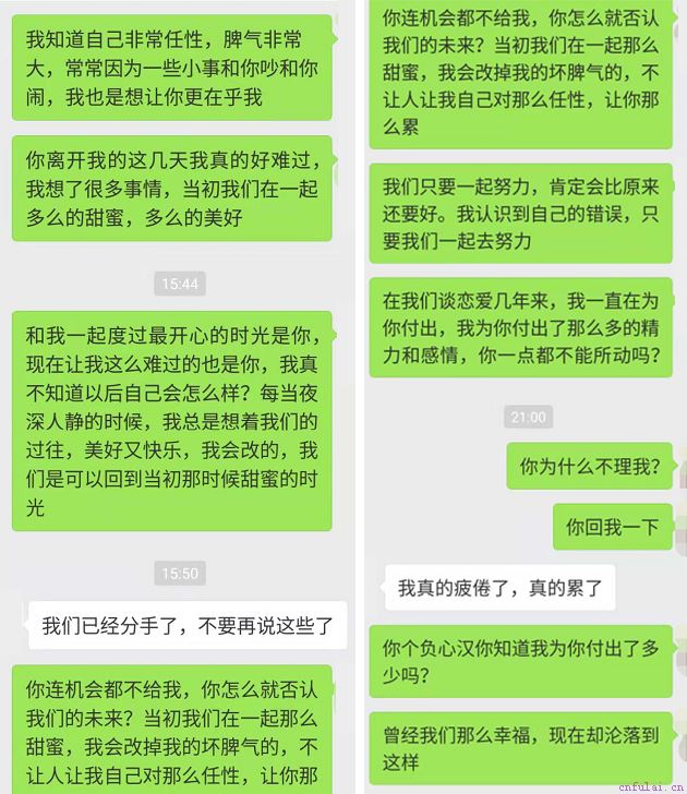 于是我开始用自己的办法努力挽回李靖已经远走的心。刚开始,我不断地给他打电话,他还愿意接听,在电话中,我不断承认错误,告诉他,我们未来多么美好,只要我们努力就一定会幸福。但是渐渐的他不接我的电话了,我就开始发短信,向他诉说我对他如何好,在三年中为他付出多少,甚至还骂他是负心汉。