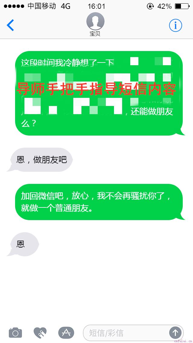 首先要从心态上去接受分手这个事实。也许分手之后你会想起来跨越遥远的距离去找她,也会想起来发动你和她各自的社交圈,也会想方设法的去承认自己的不足——但是这都为时已晚了,而且现在也尽量不要再去做了。接下来你要认同的一个观点就是:你要证明自己是可以把生活过的精彩的,甚至是比她还精彩。当你有了稳定可上升的工作模式,当你会按时进入健身房开始运动,当你每周都会有一到两次的朋友聚会和郊游,当你开始学习提升一些专业和生活技能,你就开始渐渐的形成了一个良性的状态——而且你欢迎她再回去做这个世界的女主人。当这样精彩的状态勾勒出来的时候,她不会再认为你们之前描述的那些未来是遥不可及的了,而是你已经在努力去营造的。所以,我指导孟君按照我的话术,发一条短信告诉目标(导师专业指导,切勿私自操作),自己已经接受分手的事实,隐藏自己的需求感。在这个阶段,道歉复合不是关键,稳住对方,保持联系才是最重要的!