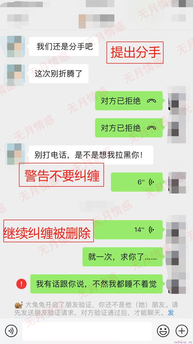 分手后,如果你的情绪崩溃,目标会表现出厌恶和抵触,两人关系对立,无法建立有效沟通。这种情况,最忌死缠烂打,为缓和关系,避免矛盾进一步激化,我们要求王鑫迅速断联,彻底从对方视线里消失。