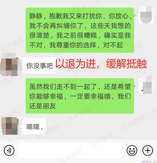 传达出自己的态度,不会再纠缠,让对方放下对学员的防备。紧接着,就要针对性的做出改变,帮助学员进行外形以及朋友圈的改造。通过发特定朋友圈,让女生觉得,学员已经心态平静,不会继续死缠烂打,唤醒女生对过去的美好回忆。让女生自己判断出,学员是可以接近的,学员其实是非常优秀的。同时学员情绪有波动时,心理咨询师及时掌握学员心理动态,帮助学员进行心理辅导,缓解内心的痛苦,尽快从分手阴影中走出来。