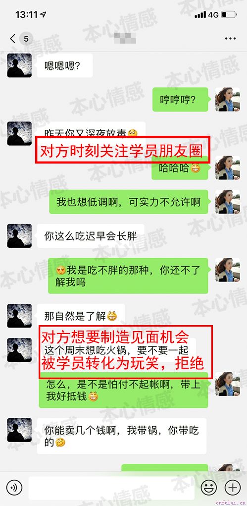 很多时候由于学员因为不懂换位思考或特殊原因,并不能把感情经过完美还原,导致在跟踪指导时仍会发现一些潜在问题,如果学员们准备和老师进行学习,一定要把经过叙述清楚,避免挽回风险。在了解到学员的问题后,老师安排学员一边提升自己,一边在导师实时聊天指导中观摩导师的言语组织风范借以参考消化!通过数十天的指导学习和朋友圈建设,对方不仅已经开始主动寻找学员聊天,聊天内容上也经常会出现互动性的表情包以及各种邀约。