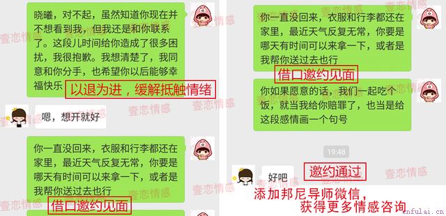 待两人有过数次良好互动之后,咨询师决定逐步安排学员主动与目标进行联系,在此之前学员却突然收到了目标发来的微信,意外地推动了我们的进展。通过后期学员对目标的小侄子体检结果的主动关心与帮忙,两人开始有了频繁的聊天互动,关系也慢慢开始缓和。从学员多次反馈的聊天资料来看,目标潜在意识中对学员还是有感情存在的,只是两人之间的矛盾还没有完全消除。在咨询师专业耐心的指导下,学员开始学会配合目标兴趣点引导话题,通过适当的幽默言语调节双方情绪。