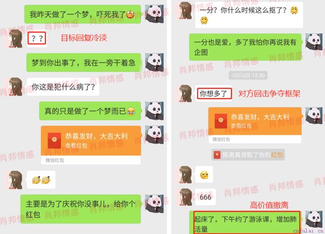 学员觉得目标有回馈了,是不是该进攻了,被主导师及时制止。以退为进之后切忌密集联系,对方会认为学员表里不一,为了挽回不择手段,增强抵触。我们又安排学员冷了三天,目的是为了降低对方戒备心,同时也给学员更多学习和改变的时间。冷冻结束,我们开始为学员展开实时指导,撩一下对方主动抽离。