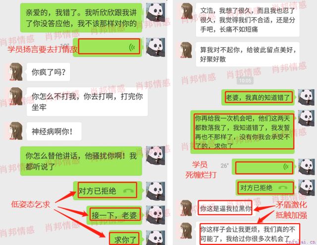 学员后期对这份感情充满不安,想要靠控制来抓紧对方,结果适得其反。学员总是粘着对方,一方面给对方造成了很大的压力,影响了相处的舒适度,另一方面也显露了学员的价值缺失,暴露了学员的不自信,男性魅力进一步丧失。一个有价值的女性,有男性追去是很正常的一件事,而女方一直在拒绝追求者,学员后期放任自己的猜忌,把矛盾升级为了彼此的信任问题,成为了分手的导火索。