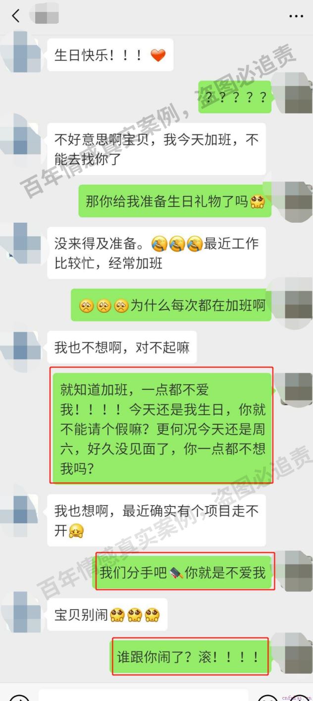 这是我们第一次特别严重的争吵,因为我周末过生日,他不仅没有过来看我,也没有准备礼物给我,仅仅给我发了一句生日快乐。我真的特别生气,当时就说要分手,不理他,还关了机。晚上一直没睡着,一直到早上才睡着,中午的时候,我起来准备出门买菜,打开门发现他坐在地上,特别憔悴。看到我开了门,他急忙抱住我说:宝宝我错了,我不该明知道你生日还加班到那么晚。我一下就心软了,毕竟我也只是说的气话。然后我们就和好了。