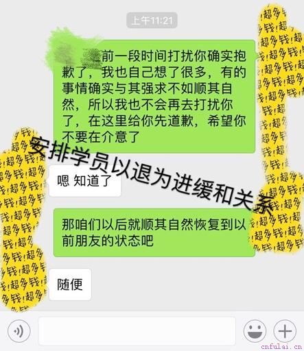 1.心态方面:我们为学员安排专属的心理导师,同期下方视频课与书本进行全程跟踪式学习。2.沟通方面:安排学员学习《无限话题聊天》,《话术语的构筑》等,以及安排学员进行实战练习。3.恋爱情商方面:安排导师进行三对一实时指导,以及《男人来自火星,女人来自金星》等课程的学习。在之后,我们为学员制定好破冰计划,针对学员这个情况,我们在选择初期进行了三天的断联期之后,通过共同朋友了解到最近小雨的心情还算是不错,于是我们决定先将两人的联系建立起来。