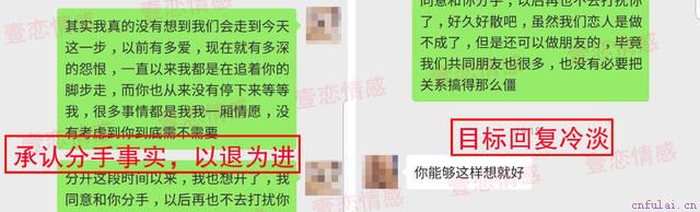 挽回过程必须严格按照咨询师团队的指导,挽回过程也是自身重塑的过程。按照咨询师指导,如何发信息,如何打电话,咨询师教你如何回复信息等等,并为你分析每一步操作的思路,代入式的帮你提升情商。联系不止是发信息,语言配合行动,需要针对性的开展挽回操作,对方需要看到你的诚意和转变,才会转变态度,直到挽回成功。学员之前有过纠缠言行,目标存在一定抵触,而且已经拉黑,需要冷处理五天。因为在这个阶段,学员做什么,对方都会觉得是错的,我们需要给对方时间冷静,也给自己时间冷静。三天后,通过共同好友的周旋,对方同意解除拉黑,不做敌人。又隔了两天,冷处理结束,针对两人情况,咨询师帮助学员编辑了一条话术信息发给对方,目的就是以退为进,让对方放松警惕,降低后期行动中的情绪障碍。