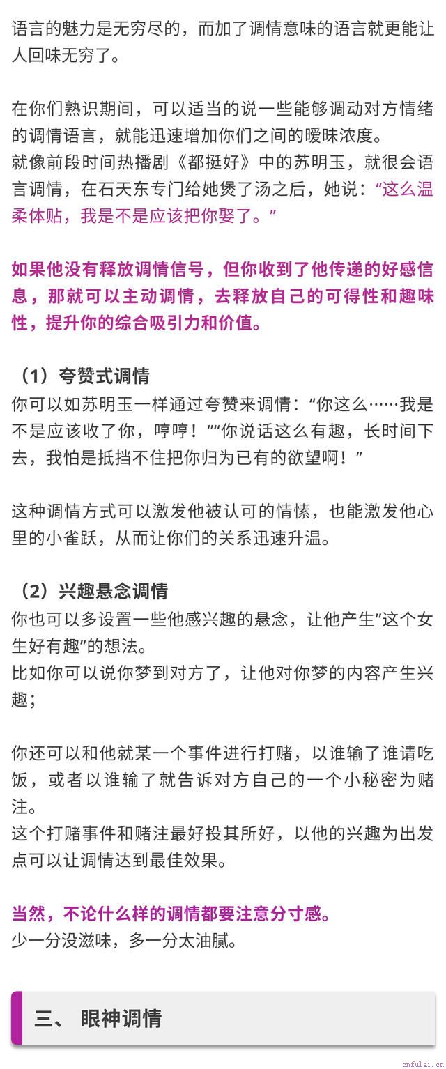 那今天我就来分享一下,如何跟优质男人调情,怎么追男孩子?教你追男生的正确方式,你知道怎么做?该说什么?怎么说?如果你想学习更多的撩汉技巧,可以添加,每天会定时在朋友圈发布一些情感干货供你学习哦~当你懂得如何跟优质男调情的时候,他就会不设防地跟你沟通,而你自信满满的气质和不卑不亢的气场,也会吸引他们的注意。你想变优秀吗?想获得那种能吸引男人的体质吗?如果你想学习,让我来教你怎么做!