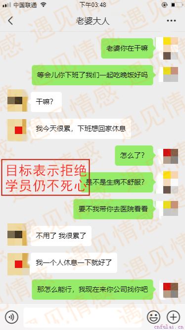 当目标提出分手时,学员没有给予对方合适的情绪缓冲期限,并对目标进行电话、微信的轮番轰炸。甚至跑去目标的公司去纠缠她,最后导致目标不得不换工作来躲避学员的死缠烂打。这种错误挽回行为直接将目标的抵触、反感情绪引燃,使局面更加僵化。