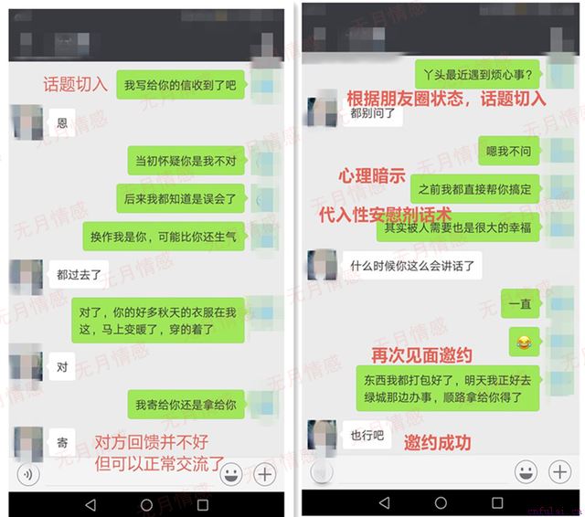 见面三分情,当面的情景对方可以踏实的看到你的转变,尤其是两人单独相处,私密空间下,所以成功的约会转场是这次约会的关键。如何轻松自然的实现转场,转到哪里?经过导师团队的反复研讨和推敲,我们把转场的目的地设在学员租住的房间。挽回到了关键时期,任何一个环节都不可以犯错,我们对约会的流程进行了详细的设计和推敲,包括约会的穿着、场景设定、约会中可能设计的聊天话题,以及肢体接触的分寸等等,给出了约会计划书。约会中我们故意要求学员先吃饭聊天,晚点交还物品,交还中遗漏重要物品,并且带领目标回家去取,成功实现转场。见到曾经朝夕相处的场景和物品,学员又拿出了曾经允诺给的小礼物,目标感动落泪,两人紧紧相拥。此次挽回历时31天,成功复合。