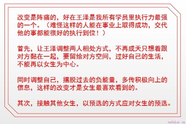通过我们的调整,双方的关系开始发生了变化,女生已经和那个处处不如他的男人分了,王泽和她的关系开始重新暧昧起来。为了逆转他们之间的关系,我适时的让王泽在给女生提供价值的同时也索取价值,比如让女友也为王泽做些事。因为过去他们的生活都是王泽全部包办,女生在这段关系中会无所事事。而一个无所事事的女人会做什么?第一当然会作,会通过各种方式作,为了引起对方的注意;第二闲下来就有时间接触其他人,增加出轨的几率!