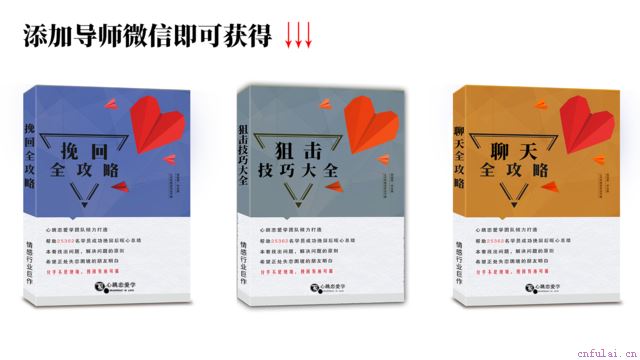 今天添加心跳导师的微信,发送我要挽回。导师将会免费赠出团队独创的专业类应用书籍《完美关系的三大秘籍》。此套书籍,是行业内目前备受好评的实战技巧类书籍。能够快速让兄弟想要改变的兄弟们得到提升。
