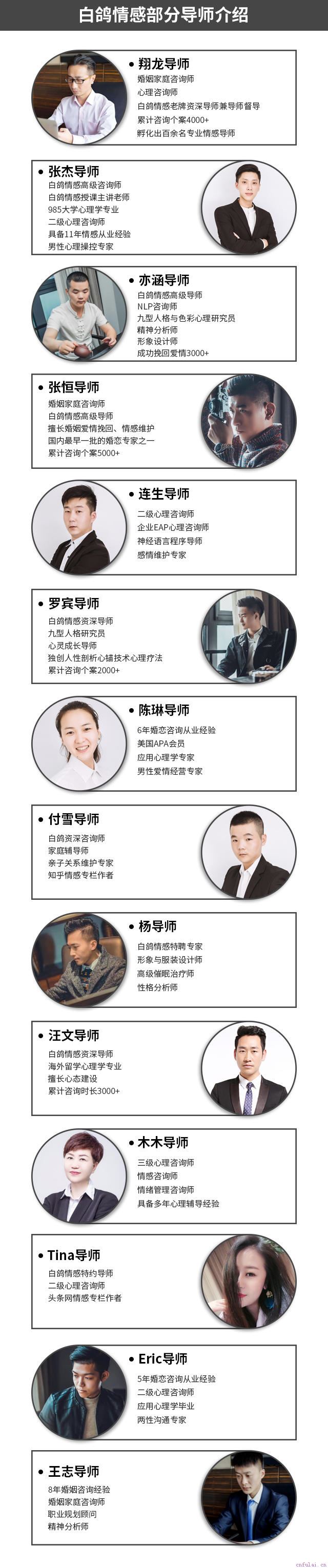 我是白鸽老师,也是小鹿平台认证的情感老师团队,旗下有三十余名持国家心理老师资格证的情感老师,在成立的11年里,我们累计解决挽回、婚姻、第三者问题两万余例,解决率高。