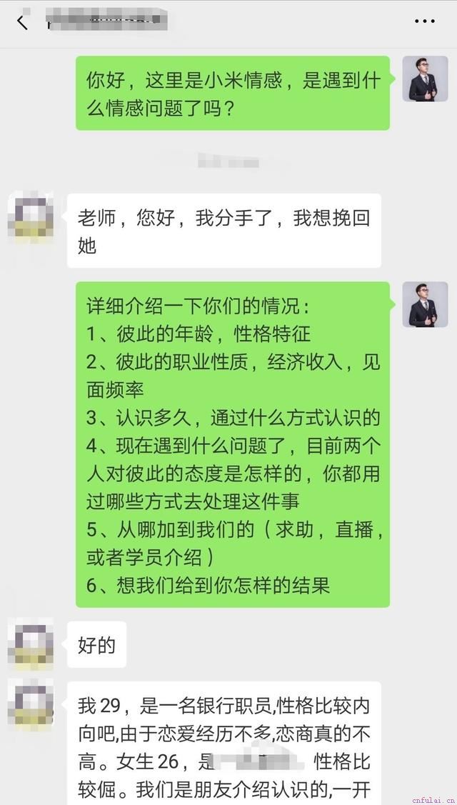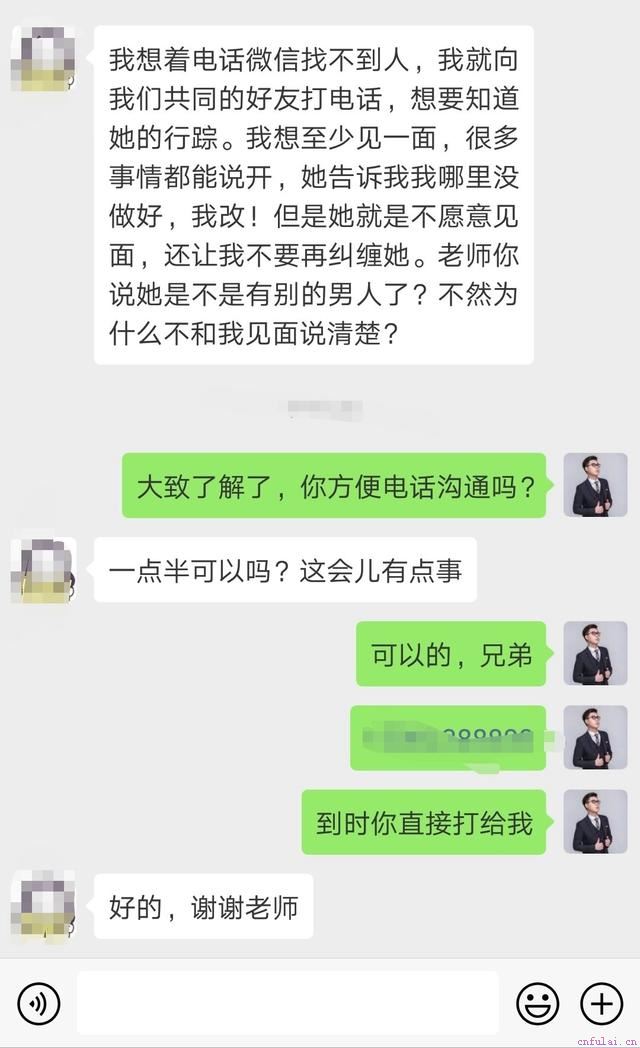 最后,我们想说的是,被分手,并不代表你们不适合,只是说明你那段时间的状态令对方不适。她如果真的对你没兴趣就不会在一开始选择你,失恋后复合的几率是很大的,但比复合难得是,如何在复合之后让感情真的能稳步前进。各位兄弟如果有什么情感问题需要咨询,想挽回她、追求到她,自愿跟你在一起,咨询老师,获取与咨询师一对一咨询机会。老师会根据你和女孩的不同性格和现实经历进行全方位解析。并且分析后会告诉你成功率,以及后续操作方法,并给予适合你的服务及服务建议。老师的的朋友圈有大量干货可以学习,以及更多全程完整挽回案例,可以教你挽回死心女友的绝招。