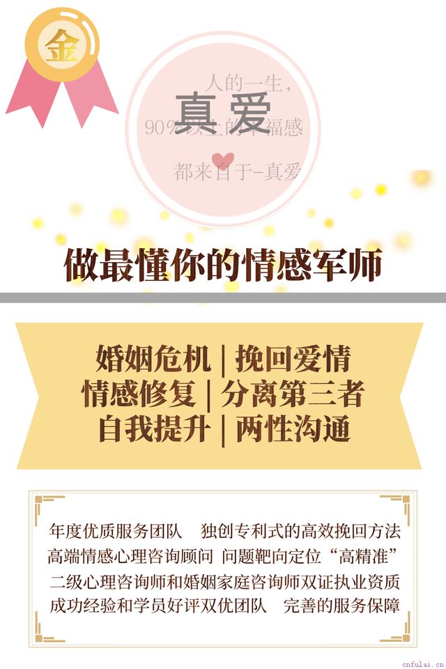 大家好,我们是MFT情感治疗体系的创始者——真爱团队。十几年的发展历程,以往上万的真实案例,让我们在解决挽回爱情、婚姻修复、分离第三者等3大类问题上,成功经验多、好评度高、实力资历老。秉承不忘初心、专业可靠的理念,让我们能切实、高效的教你解决情感危机!