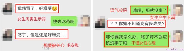 所以当女生说我感冒了,男人的第一反应是吃药和看医生。而当女人向自己的同伴发出求助信号时,一般都是求安慰和求吐槽。所以,深谙女人心的回答应该是这样的:啊?怎么回事?怎么那么不会照顾自己呢。要记得按时吃药多盖被子多穿衣服多喝开水。我没办法在你身边,你要好好照顾自己呀!不然我会心疼的你看,如此一来你们的关系还不越来越好?恋人伤心、委屈、恐惧时,请一定露个影、出个声。