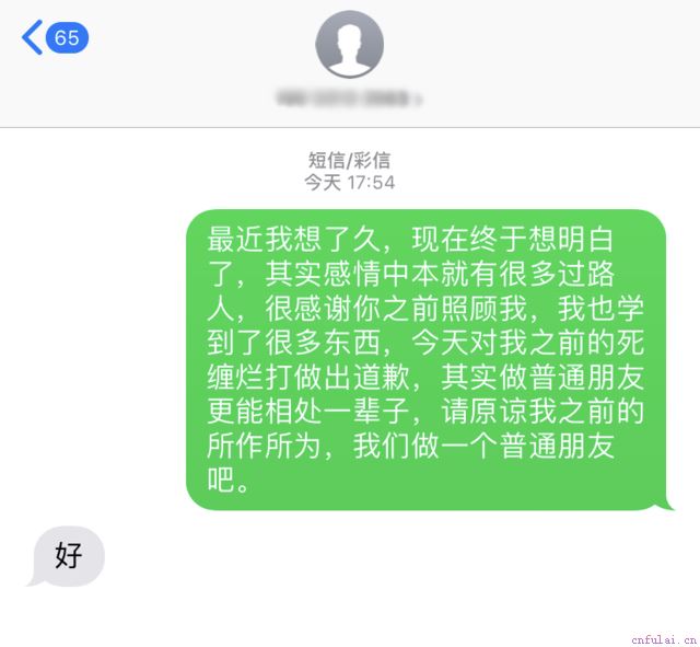 我们本来打算见双方父母准备订婚了,我也不相信他能说放下就放下,于是在第三天我便联系到了他,但无论我怎么去求和,去道歉,去挽回,他都下定决心的要分手,说再骚扰就连朋友也别做了。(分手后的情绪化最可怕,因为害怕失去而去盲目的道歉挽回,只会让对方更加反感,导致自己身处被动的局面。分手后首先要做的就是平复情绪,只有在理性的状态下,才能准确的分析问题所在)