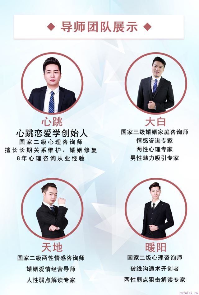 大家好,我是心跳。10年来专注于为大家解决真爱挽回,狙击真命,婚姻经营三大板块的情感问题。教大家如何通过正确的方式方法,通过实战技巧,获得真爱。截止2019年初,我们团队已经成功帮助25000+名学员解决情感问题,获得爱情真谛。