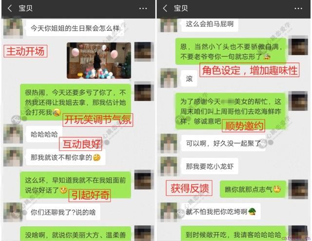随着朋友圈互动的增加,我们开始安排学员主动破冰,建立一些直接的联系。用一个不得不联系对方的理由作为突破口,以防目标反感。复联初期,互动容错率会比较低,我们会全程把控学员的聊天方向。在经过多次的模拟对话之后,学员慢慢掌握了引导目标聊天的技巧,两人在聊天时的互动开始渐入佳境。聊天最重要的就是引导对方进行情感投资,就是让对方帮你一点小忙,在拉近距离的同时把话题的重心维持在自己身上,更多的占据主动进而获得展示价值的机会。