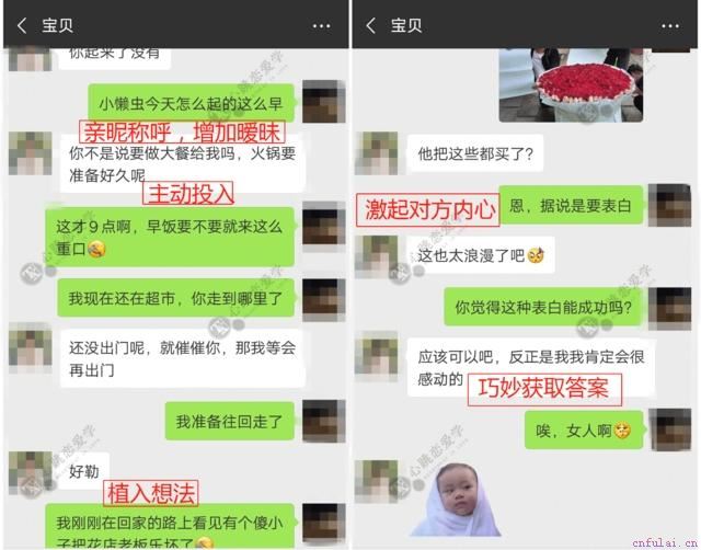 这些测试都是需要循序渐近的,女生反应不好的时候要主动退后一步,并且要及时化解尴尬;反应好的时候要主动进一步进挪,升级暧昧关系。在我的全程把控下,两人在在第三次电影院约会中,牵手成功。这个时候,我们判断复合的窗口已经打开,可以准备最后的复合表白。接着良好的反馈,我们让学员试探性的发出了一次单独邀约,这次目标也没有表现出拒绝。第四周的周末,学员和目标约定的是中午。但是目标一大早就发来了微信,学员回复说现在他还在超市买菜,其实学员早已做好所有准备,当时正在和花店老板商量送花事宜。