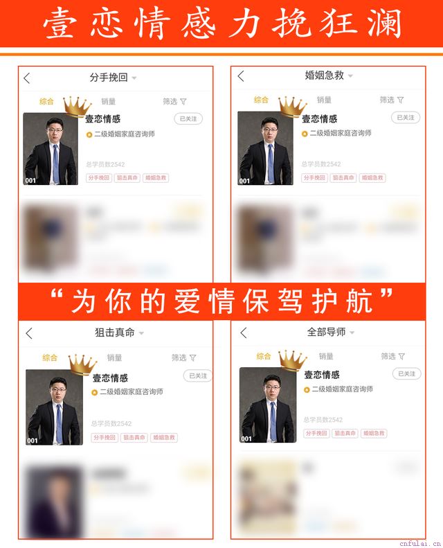 大家好,我是壹恋情感金牌导师辰辰导师,专注情感教育行业八年,旗下有三十余名持有国家心理咨询师资格证的情感咨询师,帮助上万名学员成功挽回真爱以及婚姻修复。主要为大家解决几大板块情感问题:挽回爱情、婚姻修复、狙击真爱、心理重建、两性升温、沟通技巧提升,专注分析男女两性问题,教你如何通过实战挽回爱人,获得真爱。作为平台入驻时间长,成功案例多,好评率高,导师资历高的优质团队,我们团队的服务质量和学员评价都在平台前列。