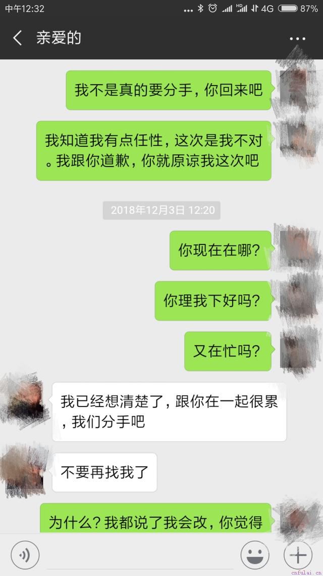 我觉得他就是不爱我了,我开始有意无意地通过闹分手等各种无理取闹的方式来达到自己的目的,结果导致两人矛盾不断积压,争吵的次数与日增多。有一天,他晚归,我堆积很久的怨气全部爆发了,最后我说这日子过得太没意思了,分手算了。他说好的,之后就离开了家。本来我只是想激一激他,谁知道他毫无动静。我开始慌了,疯狂给他发信息打电话,他铁了心要分手,说跟我在一起很倦很累,不想继续了。