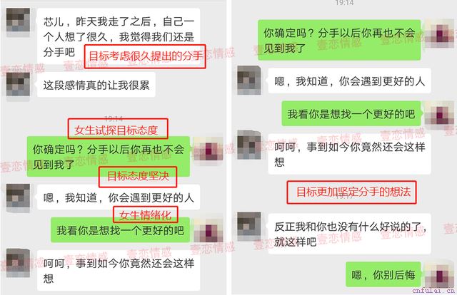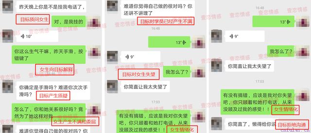 学员情况分析 像学员这种情况,在感情中主要犯了以下几个错误,最终才导致两人感情破裂: 问题一:不懂男人心理,忽略男性情感需求 爱情中,不光男人要理解女人,女人也要学会去理解男人。 在目标因事情晚点赴约时,学员不是体谅目标,而是抱怨,让对方的情感需求得不到满足,进而开始对学员产生不满。 追究其原因,其实还是学员不会和目标沟通,才导致两人之间的误会和矛盾越来越深。 问题二:占有欲太强,引起厌烦 适当的占有欲可以为增加爱情的热度,但占有欲太强就势必引发男性的厌恶。 在案例中,我们可以看到学员膨胀的占有欲,包括一直反感目标与同事的交涉,拒接其同事电话。 在处理这些问题时,没有采用正确的方式与目标沟通,而是一再使性子,甚至自作主张挂断目标同事电话。进一步加剧两人之间的矛盾。 问题三:付出太多,错误挽回 无理取闹,这是很多女人都会做的一件事。其最根本的目的是想得到男人的关心。女人在一段感情里,付出越多,就越会担心失去。那么女性就会情不自禁的跟男人闹。 在两人感情已有裂痕的情况下,目标以为借吵架表达不满,就能让目标的态度发生转变,对自己投入关心,殊不知这样加剧男友对自己的不满,使两人最终走向分手。 错误的沟通方式只会把对方越推越远,如果你也因为自己的情绪化严重,不会和他进行良性沟通。那么现在就可以添加咨询师微信#微信#,一对一咨询辰辰咨询师,我会给予你专业的情感分析,教你最快速有效的沟通技巧。现在添加还可获得一次免费的情感咨询机会。