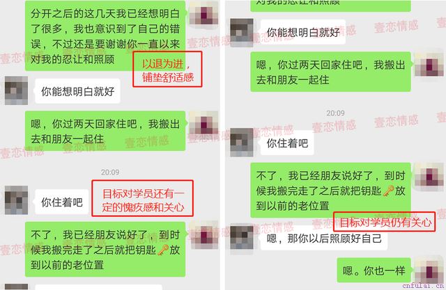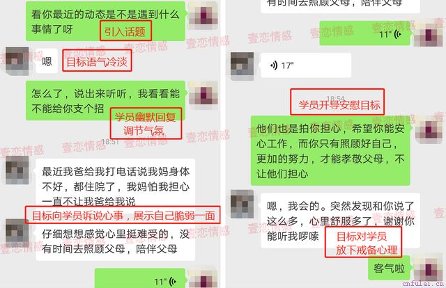 挽回不是一蹴而就的,只有通过改变和提升自己,逐渐吸引到对方,建立二次吸引,才能让对方看到你的改变,增加挽回的几率!如果你也想和他一样,通过学习来改变自己、提升自己,可以添加咨询师微信#微信#跟我们一对一的咨询,把你具体的情感困惑跟我说一下,我会详细的帮你分析! 第三步:试探目标态度,抓住窗口,恢复联系 在学员的展示面获得了多次反馈后,咨询师决定安排学员以第三方理由为出口找目标聊天,试探目标情况。 由于学员在恋爱中出现的沟通问题,咨询师在其形象改造时期,还为其进行了初步的聊天服务培训。 在培训中,咨询师对学员进行专业的聊天指导,其中以下几点值得学习: 1、创意性开场:选择目标兴趣范围类的称呼开展聊天,并真诚表达自己的目的,收获对方好感。 2、兴趣点切入:根据对方兴趣点寻找话题,并作为聊天递进的切入口。 3、语音加深印象:既能加深个人印象,又能侧面显示出自己已经放下,无所顾虑的心态,瓦解对方的防御机制。 咨询师指导学员以落下东西为由,打开与目标的聊天窗口,顺势以取回物品为由约见了目标。经学员反馈,当天学员表现稳定,在接过物品后,婉拒了目标的晚饭邀约,直接离开。 由于,近段时间的学习改变及形象上的优质改变,再加上对自我生活的丰富以及相处时对自我价值把控的得当表现,让目标对她的变化了一定的好奇心,并主动找到目标浅谈了一些生活近况。 就在这时,目标主动向学员打开了聊天窗口。为了保证聊天达到最好效果,咨询师特地为学员开启了一对一实时指导服务,为学员和目标的初次接触保驾护航。 在咨询师一对一实时指导服务结束后,学员和目标陆续开展了几次聊天,进入到后期,聊天效果显著。