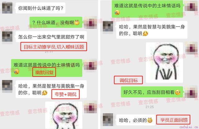 从学员的反馈来看,目前两人的聊天已有一些成效,但依然还有待加强。于是咨询师又针对两人的情况,指出了两个聊天关键点: 1.控制主动性,引导对话 通过开放性问题的提出,引导目标思维,隐藏自己的需求。 2.传递个人价值,持续吸引 适当的顺应目标话题,暧昧推进,但同时自己掌握决策权,让目标无形中被自己的个人价值所吸引。 通过这样的方式,将自然聊天慢慢推进到暧昧聊天内容。