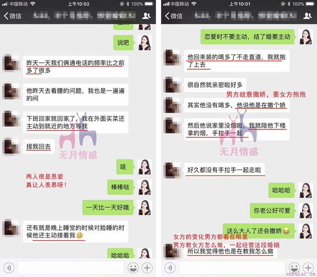 经过两次转场,这次约会给对方留下了非常好的印象,肢体进挪也很顺利。当天晚上回家后,微信聊天的过程也非常开心,对方给与学员新的认可。导师趁热打铁,约对方周末一起出去玩两天,瑶瑶没有拒绝。我们安排学员准备了一套情侣装,并且买了瑶瑶很喜欢的手链,旅行途中成功表白复合,当晚两人又住在了一起。