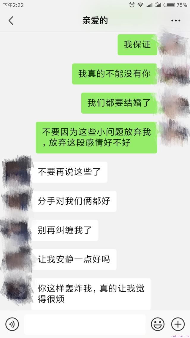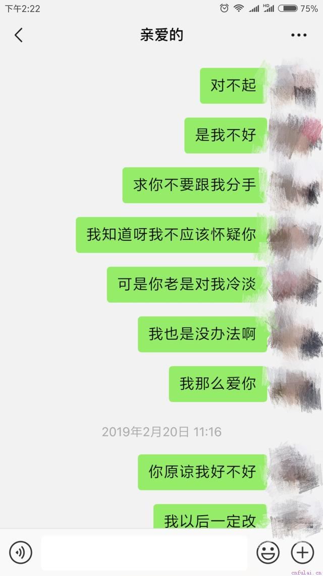 他越这样,我越怀疑害怕,只要他回家晚,在家手机聊天我就要盘问查看,他对此很生气。有次他回家晚,面对我的质问,他黑着脸提出了分手。我伤心极了,不知道自己做错了什么,我觉得我都是因为爱他我才会这样的啊,我给他打电话发信息解释道歉讨好,但他就是铁了心要跟我分手。