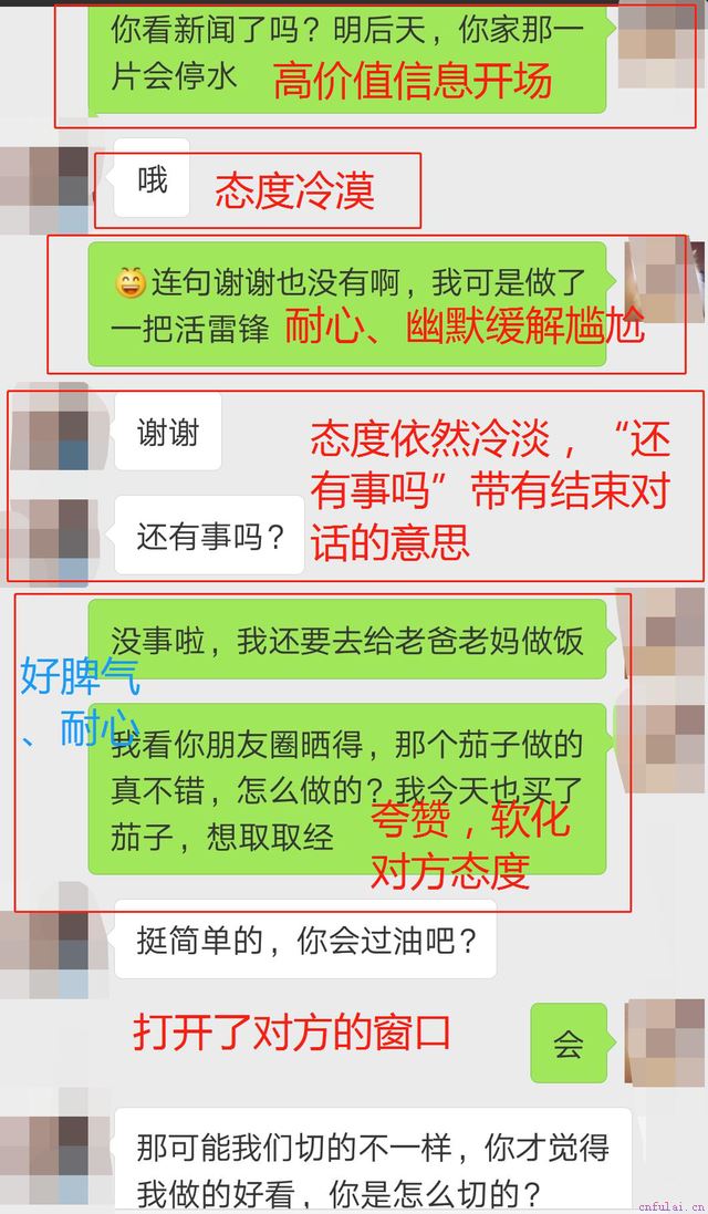 如果对方的态度有点冷淡甚至高傲,你就不要有事没事总去骚扰他。你要找他聊天,就先说一些有价值的话题,不要抬杠,对他多一些尊重或是赞美,让他的情绪得到满足。时间久了,自然就慢慢打开了他的窗口,对你更依赖、更信任。当然,在这个过程中,一定要有耐心,不要轻易和对方发脾气,在佳新咨询师的印象里,挽回较的学员,一定是比较听佳新咨询师的话,自己做事也相对稳重,有耐心的。