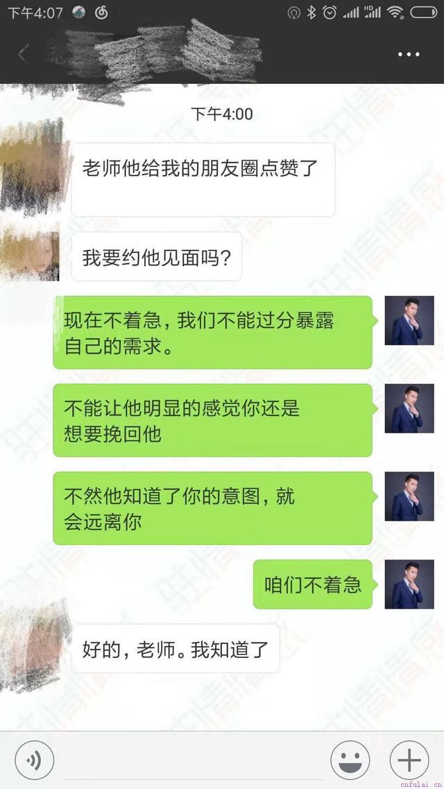 在任晴展示了自己积极生活的朋友圈之后,林天慢慢的会给她的朋友圈点赞了,这让任晴很高兴,她迫不及待的想要立马和林天重拾爱火。想要马上和他见面。咨询师制止了她,因为在很多案例中都是因为学员太过于心急挽回,导致对方知道了学员想要挽回的意图,让男方态度变冷淡。在咨询师的的劝阻下,任晴继续和林天用微信进行聊天。没有迫不及待的想要见面了。