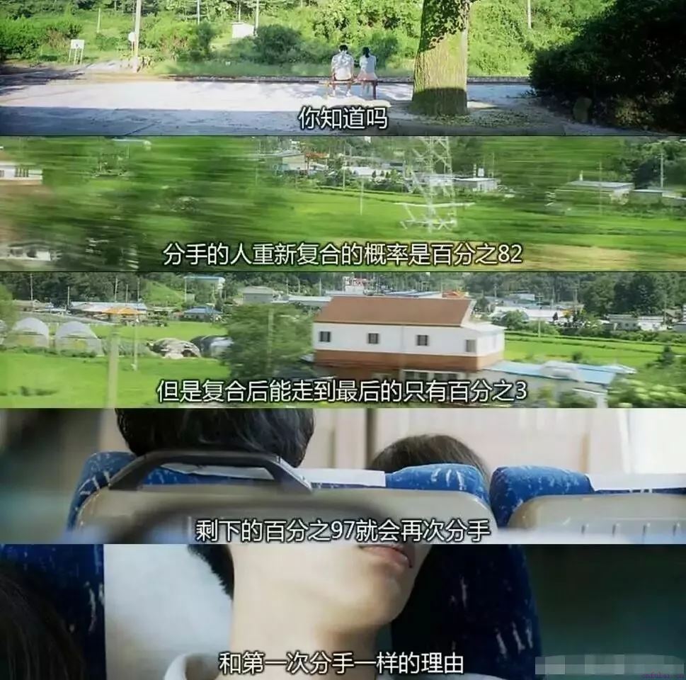 有部韩剧《恋爱的温度》,里面有句台词:分手的人重新复合的概率是百分之82,但是复合后能走到最后的只有百分之3,剩下的百分之97就会再次分手,和第一次分手的理由一样。