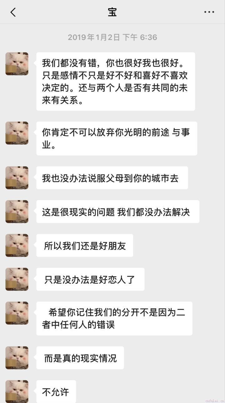 就这样两个人谈了一年。 可是好景不长,在跨年夜的时候,他喝多了,睡了一天一夜,睁开眼就看到了女生的分手短信。和别的分手短信不一样。他的分手短信写的非常没办法让人去辩驳什么。