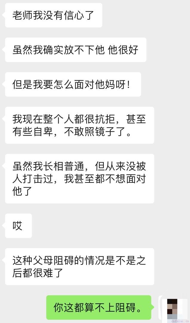她觉得自己的自尊心受到了碾压。她觉得自己的感情是不被未来婆婆祝福的。所以她想放弃了。她告诉我,她原本非常自信,但这件事之后,她开始害怕照镜子。