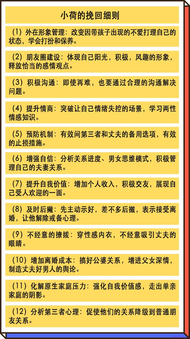 此后,老公经常借着回来看女儿的名义,向我打探追我那个男人的条件。老师让我稳住,尽量把对方条件往上抬,还让我在老公来时做好可口的饭菜,把家里布置得很温馨,穿上性感又得体的漂亮衣服,在和女儿的互动中展现自己的少女感。
