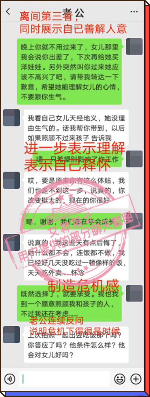 老师告诉我,这样做可以有效离间第三者和老公。老公转达我的歉意后,如果第三者生气,势必会引发他们之间的争吵,也就达到离间的效果了。