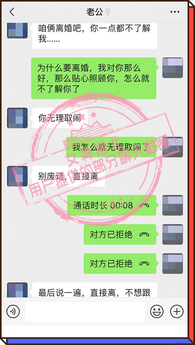 说完他就摔门而去,我给他一遍遍打电话,他拒接,说直接法院见。此后我每天给他发消息,他都不回我。