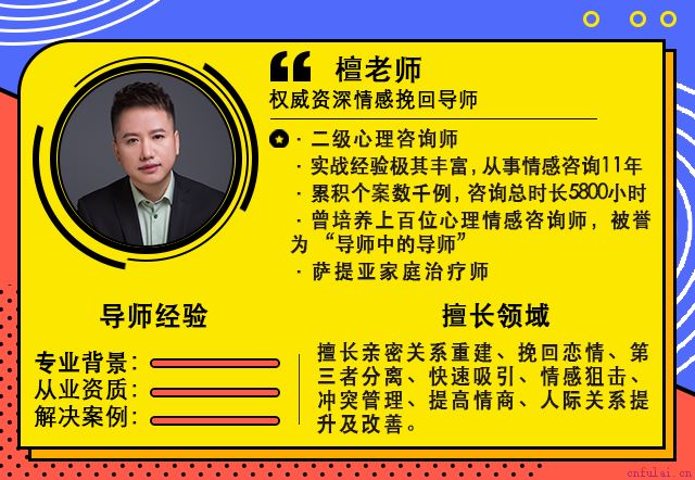 大家好,我是女神指北的檀老师,参与研究了《我该如何挽救被拉黑的亲密关系》、《二次吸引》、《九型人格》等情感项目,擅长解决分离第三者、破冰复联、分手挽回等情感难题。