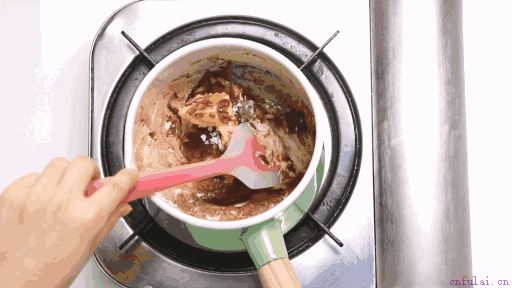 3. 锅中倒入200克黑巧克力、3克糖、5克黄油搅拌均匀