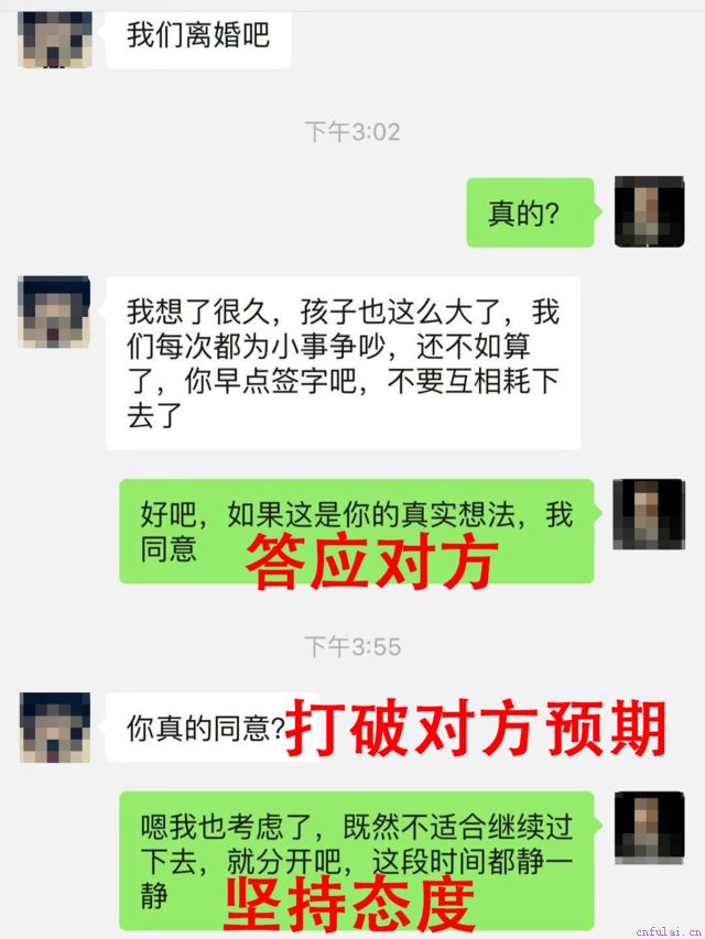 在这种情况下,我们要掌握自己的主动权,否则往往会处于被动的状态。首先要让对方跟着你自己的思维走,要超出他的预料。小伟就是料定了小田不会同意离婚,所以自己才会特别的胸有成竹,在这里我们要将自己转变为主动的一方。第一步,你要学会有技巧的不跟着对方的预期走,让他一开始就稀里糊涂的与你说再见。所以在这里就让小田先主动同意离婚请求,这样才容易让对方产生触动,而不是一副早就料到你不敢离的态度。
