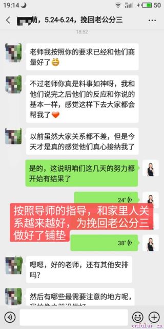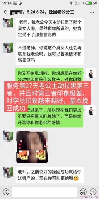 在和老陈和好之后,我们指导李佳佳从各个方面继续巩固和老陈的感情,把老陈大多数的时间留在了家里一起带孩子和做家务,能和第三者的时间就越来越少,同时把自己和老陈感情的变化展示给第三者看到,加上故意给用老公的微信第三者发送了一条语音信息,第三者终于忍不住和老陈起了冲突,最终老陈主动删除了第三者的全部联系方式。