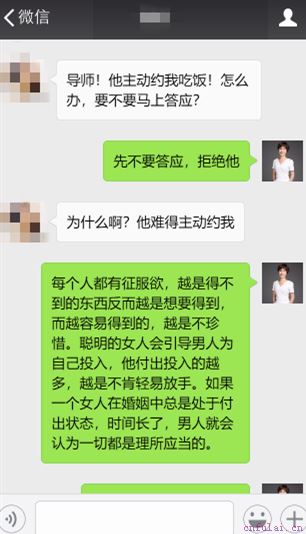 紧接着,张萍利用咨询师教的推拉聊天法把老公的虚荣心、好胜心、野心一步一步激发了出来,让林凡觉得她变了,变得不再像一位妈妈一样唠叨、咄咄逼人,而是变得温柔了许多,更像婚前的那个张萍了。过了几天,林凡主动提出来要跟张萍一起吃饭,谈谈他们之间的事。张萍拿不定注意,马上询问咨询师,她本以为林雪咨询师要我把握机会,但没想到咨询师却劝她先拒绝这个邀请。