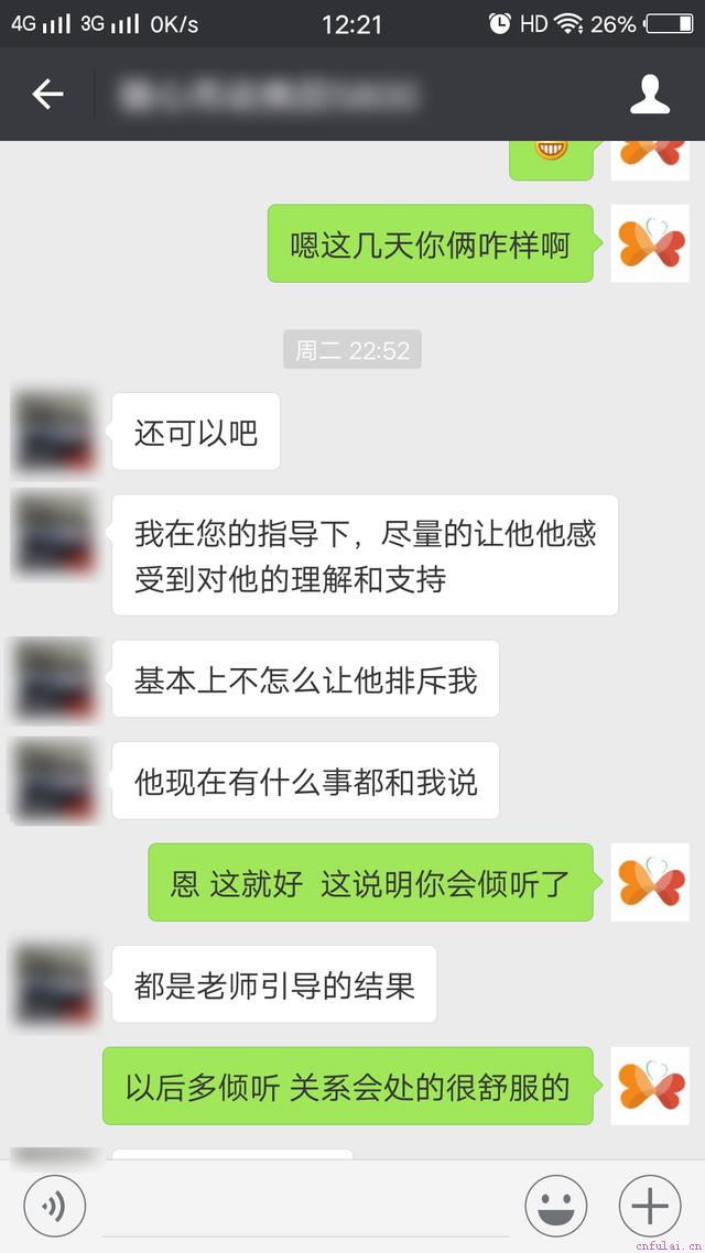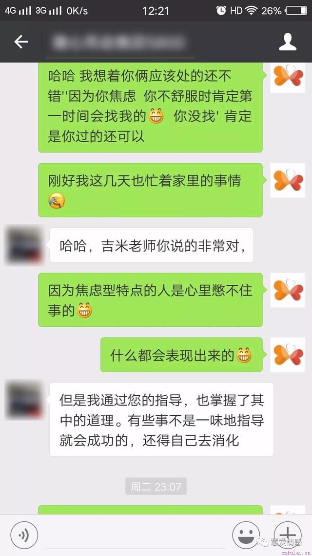 我很期待我老公回复我,结果并没有等到,我有点失望。几米老师肯定地说,不用担心,头一次沟通不求对方回复。老公看到信息,会有很大触动的,会极大改善我们的关系。我们也得给他一个梳理自己,思考的时间。第三天,几米老师再次让我给老公发一条信息,他回了句现在加班的。几米老师说,可以了,我老公愿意回复我,于是就开始帮我代聊。