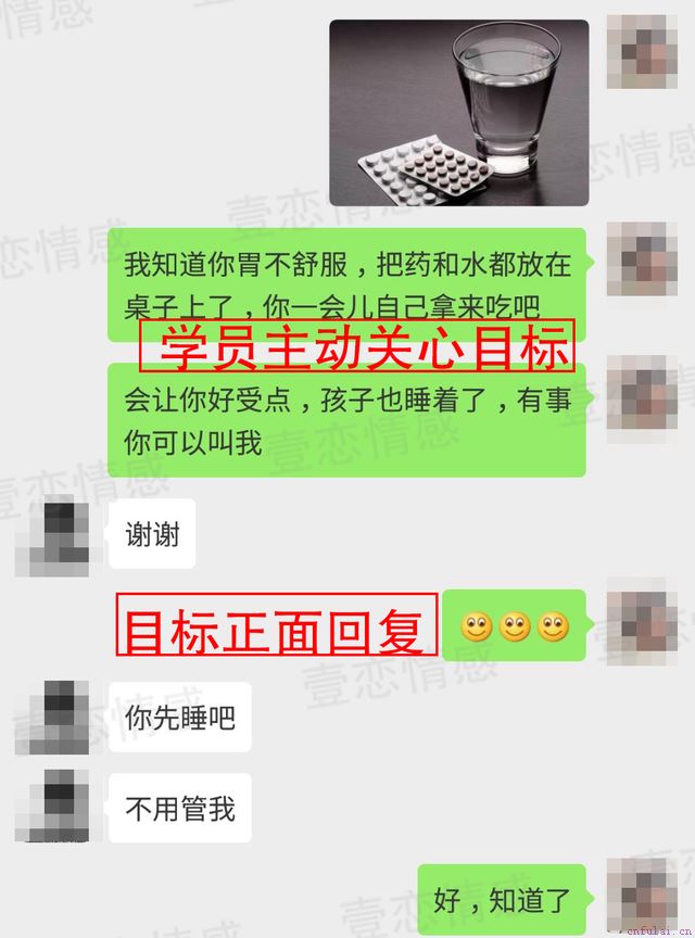 辰辰导师在电话里让我在门口这样对他说。周勇我知道你胃不舒服,我把药和水都放在你门口了,你一会自己拿来吃,会让你好受点孩子也睡着了,有事你可以叫我。导师让我说完后又发了微信给他,这样的目地并不是简单的表达关心,而是让他通过视觉刺激从内心感受到家庭的温暖。