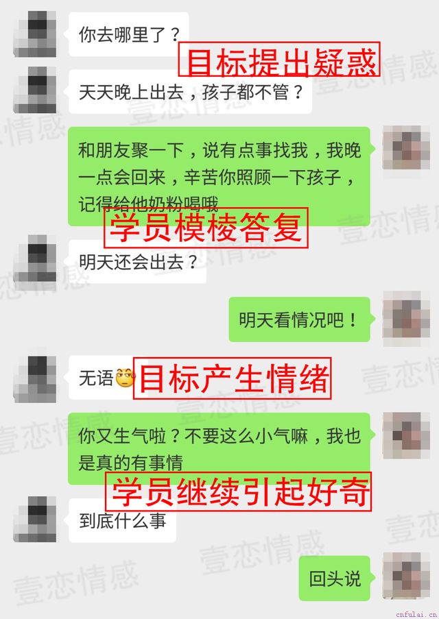 通过上面两点有效沟通的方法,周勇已开始松口了对我不像之前那么抗拒,但是就不愿意主动提起感情和复合的事,这让我挺着急的。辰辰导师安慰我说:现在局面已稳定并在向好的方面发展,不要过于明显的暴露需求感。并让我连续两天晚上化得漂漂亮亮的出门和闺蜜看电影和聊天。主要体现在周勇下班回家后,我把饭菜做好,留下纸条并把孩子也留在家里,让周勇搞不懂我要去哪里,去干什么,同时又能独立的和孩子相处。第一个晚上周勇没有反应但第二天他终于忍不住了哈哈!