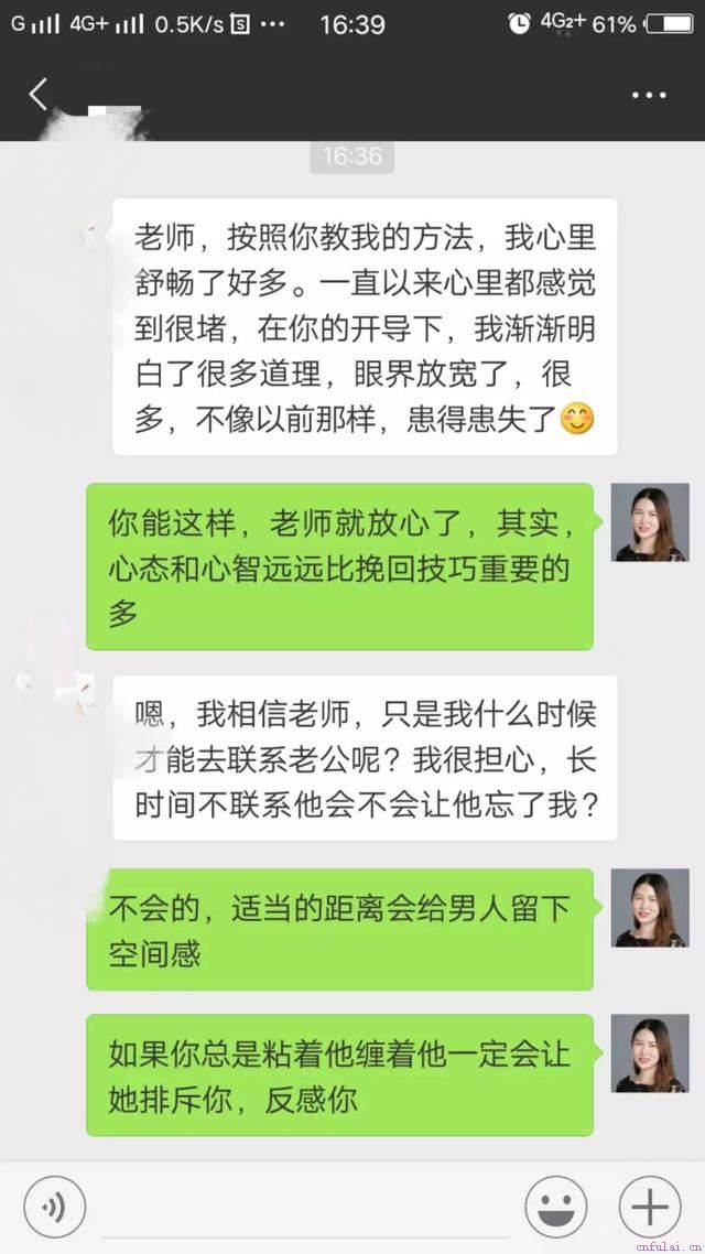 娟子一开始确实心很急躁,不太相信咨询师的方法,但在服务5天后,她明显感到自己没有之前那样患得患失了。不像以前那样拼命联系老公,反而让他对自己的态度改变了很多。出于当事人信息保密,如果你想深入了解服务过程,可以添加刘慈老师#微信#我会一一为你解答!