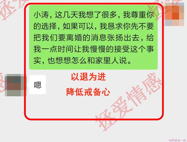 听到对方提出了离婚,很多女人都觉得不甘心,不想要就这样放弃多年的情感,会哭求对方再给自己一个机会,拼命给对方道歉,甚至不惜厚着脸皮去搬救兵,到头来不曾想,对方却离你越来越远。他决意要离婚,就已经在内心对你竖起了一道高墙,不管你做什么,他都觉得你是带有目的,因此我们这时不妨反其道而行,以退为进。导师指导小真给小涛发了这么一条信息: