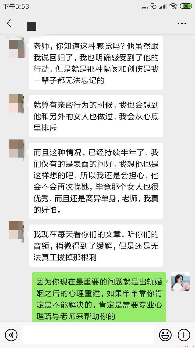 另外要新建立自信,让自己过得富足快乐,结交朋友,发展兴趣,摆脱受害者角色;最后一定要控制自己的好奇心,不要老想着追究从前出轨的细节,试探对方每一次跟异性相处的动机,要努力信任对方坦诚相待,尽管这可能并不容易。但是只有你成功迈出了那一步,你才会机会继续接下来的修复过程!